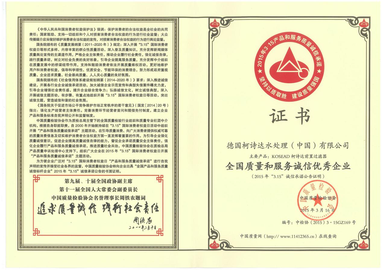 2015年“3·15”国际消费者权益保护日全国优秀企业“质量和服务诚信承诺”活动企业承诺